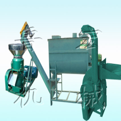组生产加工时原料通过粉碎机粉碎后经输料风管进入混合贮料机,混合均匀配制成全价粉料后,再通过螺旋提料机送入颗粒饲料机内,颗粒饲料机辊模挤压原料,摩擦升温,使原料糊化、熟化、制粒一次完成,加工成型的饲料颗粒由瓦斗提料机送入风干机内将多余的热气抽走,使饲料颗粒干燥后即可装袋保存。颗粒饲料机组工艺流程中饲料原料不需要加水和通蒸气,自动送料、进料迅速、出料顺畅,干进干出,颗粒粗细可按照每个用户的需要,在